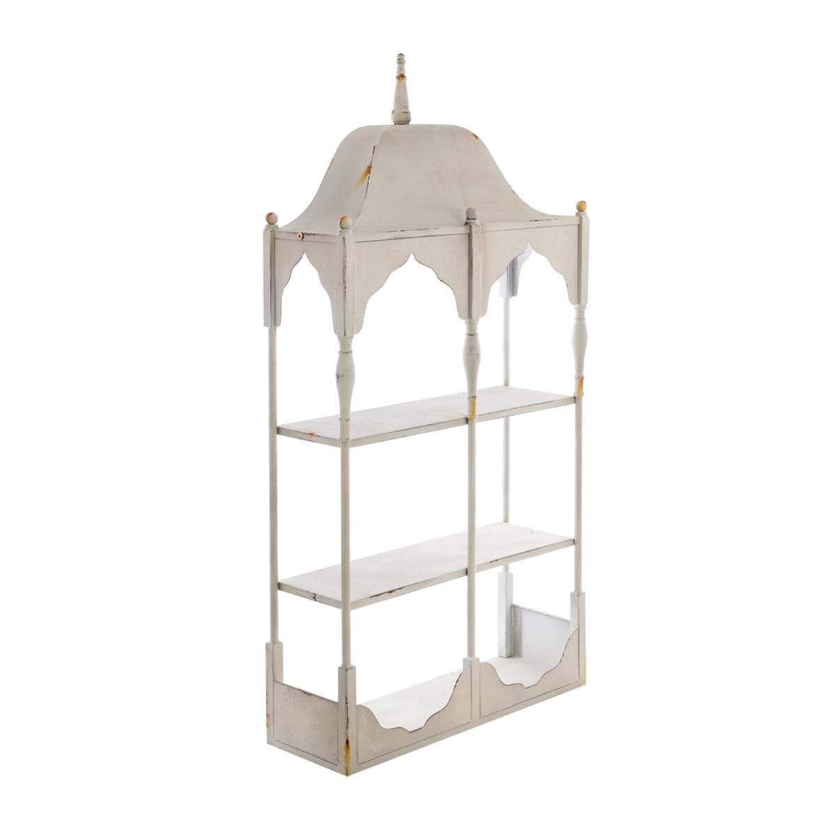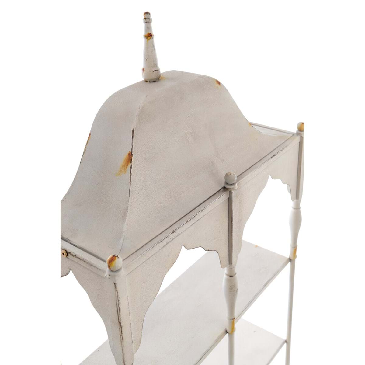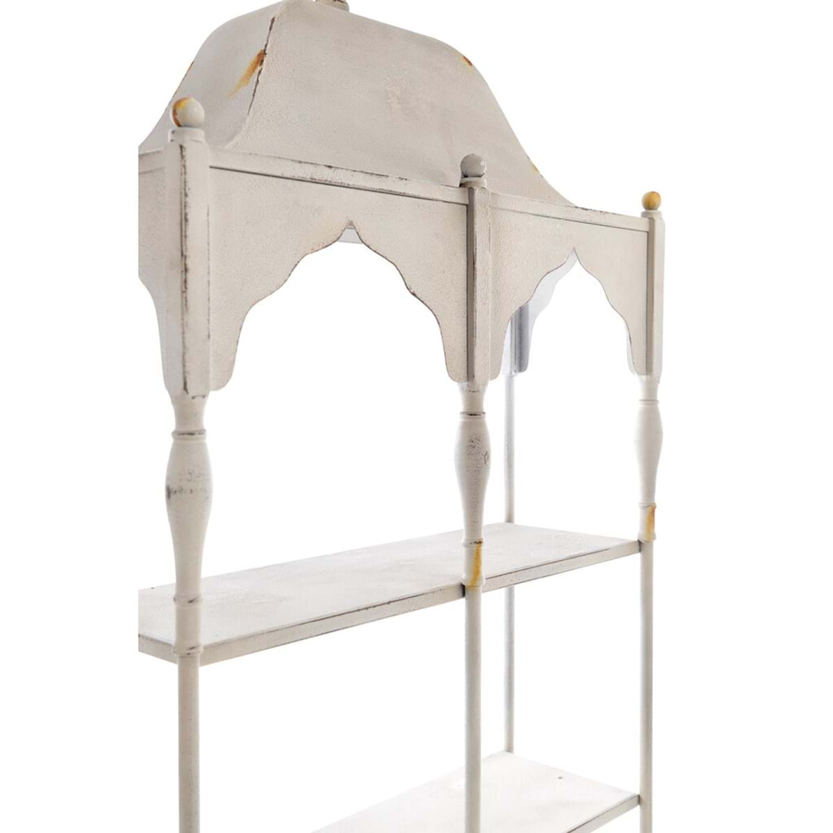 Etażerka wisząca na ścianie z architektoniczną konstrukcją i wewnętrznymi półkami, przeznaczona do eksponowania przedmiotów dekoracyjnych, zastawy stołowej lub drobnych akcesoriów.Idealna do kuchni, salonów i jadalni, dodaje charakteru ścianom w klasycznym i jasnym stylu. Kremowa półka z rdzawą patyną jest ponadczasowa i nawiązuje do stylu vintage. Kolekcja LEONOR łączy w sobie romantyczny design z funkcjonalnością, dzięki czemu idealnie nadaje się dla miłośników francuskiego stylu rustykalnego.