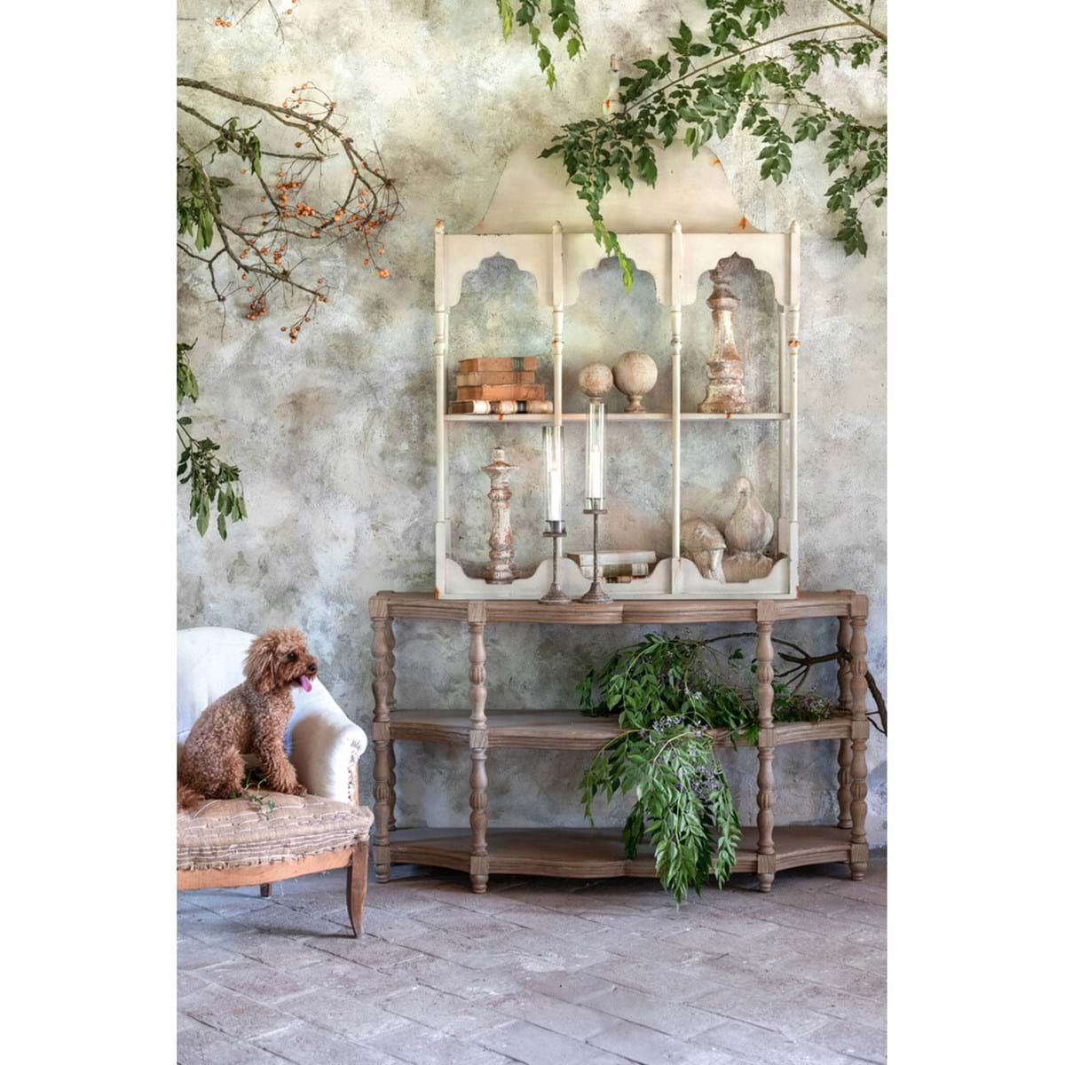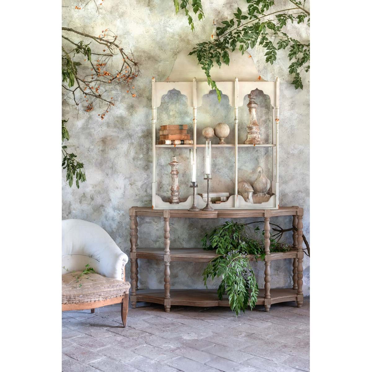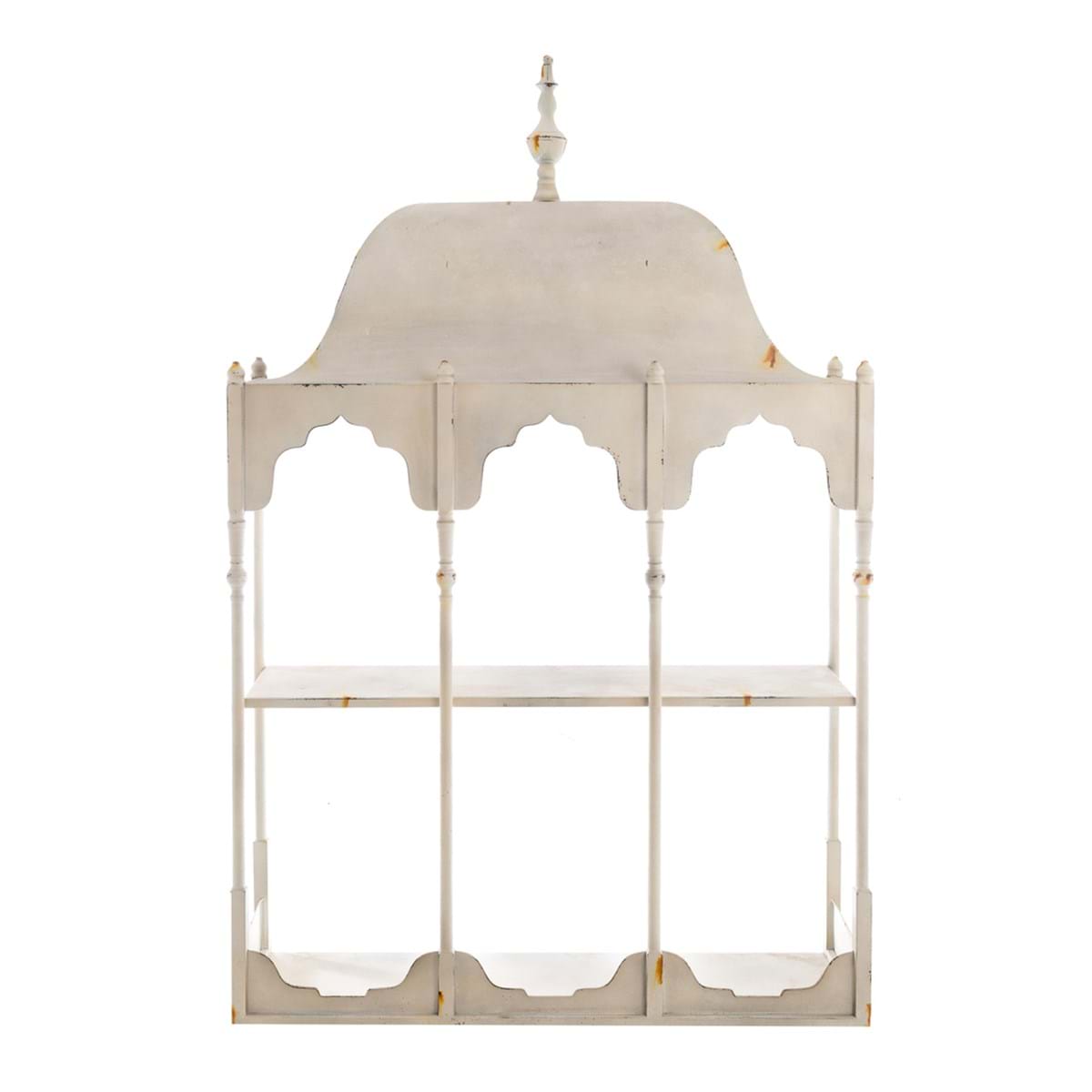 Etażerka wisząca na ścianie z architektoniczną konstrukcją i wewnętrznymi półkami, przeznaczona do eksponowania przedmiotów dekoracyjnych, zastawy stołowej lub drobnych akcesoriów.Idealna do kuchni, salonów i jadalni, dodaje charakteru ścianom w klasycznym i jasnym stylu. Kremowa półka z rdzawą patyną jest ponadczasowa i nawiązuje do stylu vintage. Kolekcja LEONOR łączy w sobie romantyczny design z funkcjonalnością, dzięki czemu idealnie nadaje się dla miłośników francuskiego stylu rustykalnego.